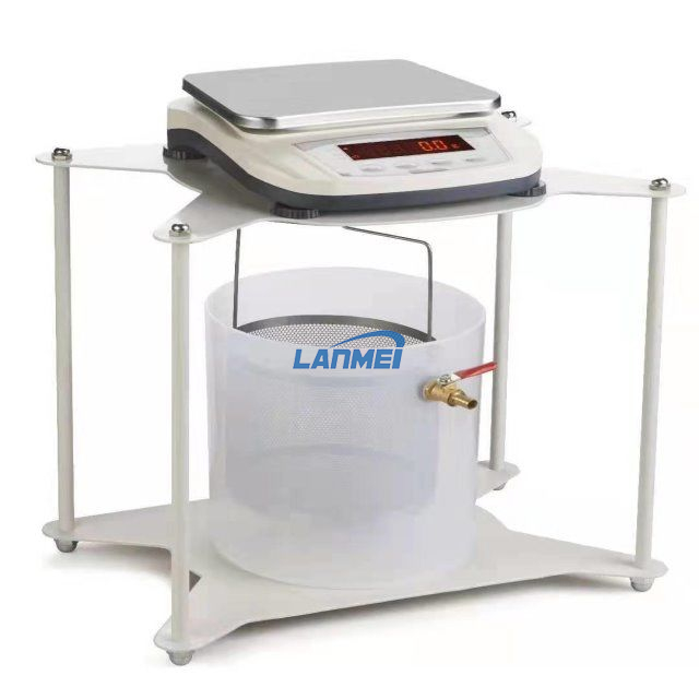 يتكون من إطار قوي مصمم مصمم لدعم التوازن الإلكتروني. يشتمل الجزء السفلي من الإطار على منصة متحركة ، والتي تحمل خزان المياه مما يسمح بوزن عينات الاختبار في كل من الهواء والماء.